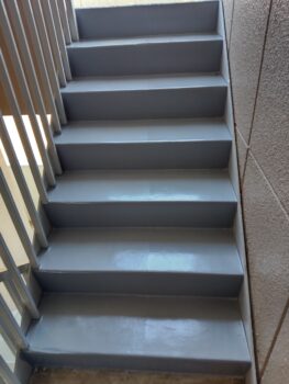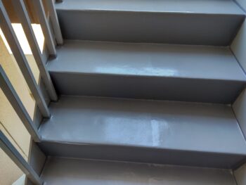 先月、階段のウレタン塗装修繕を行いました。最近は長尺シートにすることが多い共用部ですが、勿論ウレタン塗装で修繕することもあります。ウレタン塗装修繕で施工する場合、材料コストは安く済むのですが施工コストは2倍かかります。
